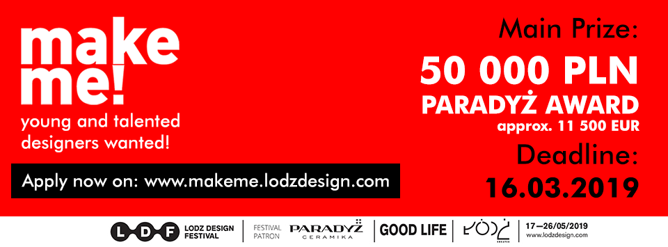 W tym roku 13. edycja Łódź Design Festival odbędzie się w dniach 17-26 maja w Łodzi, pod hasłem “Dobre życie”. Jednym z kluczowych wydarzeń festiwalu jest konkurs make me! Jest to obecnie jeden z największych międzynarodowych konkursów dla młodego pokolenia projektantów. Konkurs skierowany jest do projektantów, twórców, studentów i absolwentów, w szczególności z dziedzin sztuki i wzornictwa. W konkursie make me!, prace oceniane są przez specjalnie wybrane jury o różnych zainteresowaniach. Serdecznie zapraszamy do udziału w konkursie!