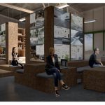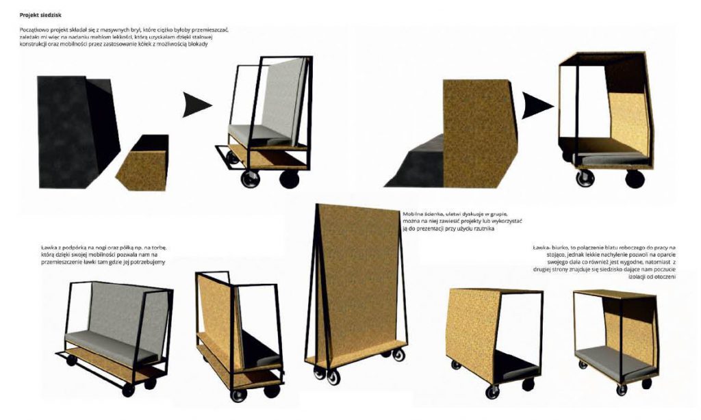 Projekt dotyczy sali M8, czyli przestrzeni zarezerwowanej dla studentów, gdzie mogą spędzać swój wolny czas między zajęciami. Moim głównym założeniem, było zagospodarowanie tej przestrzeni tak, aby każdy znalazł coś dla siebie, większe grupy mogły się tam spotkać, porozmawiać bądź przedyskutować projekty, oraz pojedyncze osoby mogły indywidualnie popracować. Wyspa, bo taki był temat, obejmuje grupę mobilnych elementów na kółkach z możliwością blokady. Składa się ona z wygodnych siedzisk, dzięki którym studenci mogą zaaranżować sobie kąt do swobodnych spotkań bądź chwilowego spoczynku oraz blatów lekko nachylonych, do pracy na stojąco, pozwalające na oparcie całego ciała. Z drugiej strony mebla mamy też możliwość usiąść, co daje poczucie izolacji od otoczenia. Zestawienie kilku modułów wyspy pozwoli również na stworzenie przestrzeni dla większej grupy studentów, gdzie przy ustawieniu mobilnej ścianki, mogliby zawieszać na niej swoje projekty bądź przy użyciu rzutnika, wyświetlać je co pozwoliłoby na integrację.