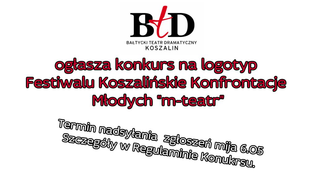Bałtycki Teatr Dramatyczny w Koszalinie ogłasza konkurs na projekt graficzny logotypu Festiwalu Koszalińskie Konfrontacje Młodych “m-teatr”. Termin zgłaszania prac mija 6.05.2019r. Wszelkie informacje dotyczące konkursu znajdują się w Regulaminie.