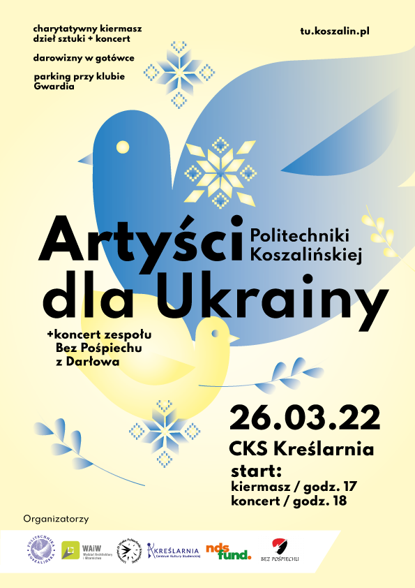 21 mar Artyści Politechniki Koszalińskiej dla Ukrainy Posted at 16:14h in OGŁOSZENIA, WYDARZENIA by IW Print page 0 Likes