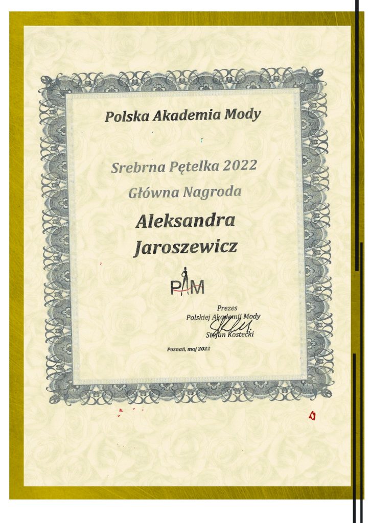 Główna Nagroda Polskiej Akademii Mody, Srebrna Pętelka 2022 dla studentki 1-szego roku Wzornictwa Aleksandry Jaroszewicz.