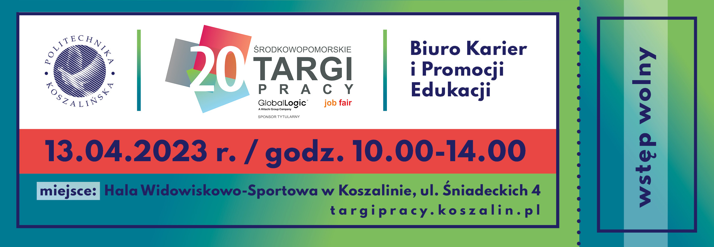 Biuro Karier i Promocji Edukacji Politechniki Koszalińskiej organizuje 20. Środkowopomorskie Targi Pracy GlobalLogic Job Fair, które odbędą się 13 kwietnia 2023 r. w Hali Widowiskowo-Sportowej w Koszalinie przy ulicy Śniadeckich 4 w godzinach 10.00-14.00.