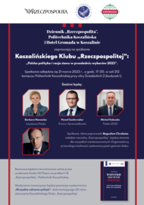 Dr hab. Danuta Zawadzka, prof. PK, rektor Politechniki Koszalińskiej, Bogusław Chrabota, redaktor naczelny dziennika „Rzeczpospolita” oraz Wiesław Świś, prezes Hotelu Gromada w Koszalinie serdecznie zapraszają do udziału w kolejnym spotkaniu Koszalińskiego Klubu „Rzeczpospolitej”, które odbędzie się 21 marca 2023 r., o godz. 17.00, w sali 212 kampusu Politechniki Koszalińskiej przy ulicy Śniadeckich 2 (budynek I).