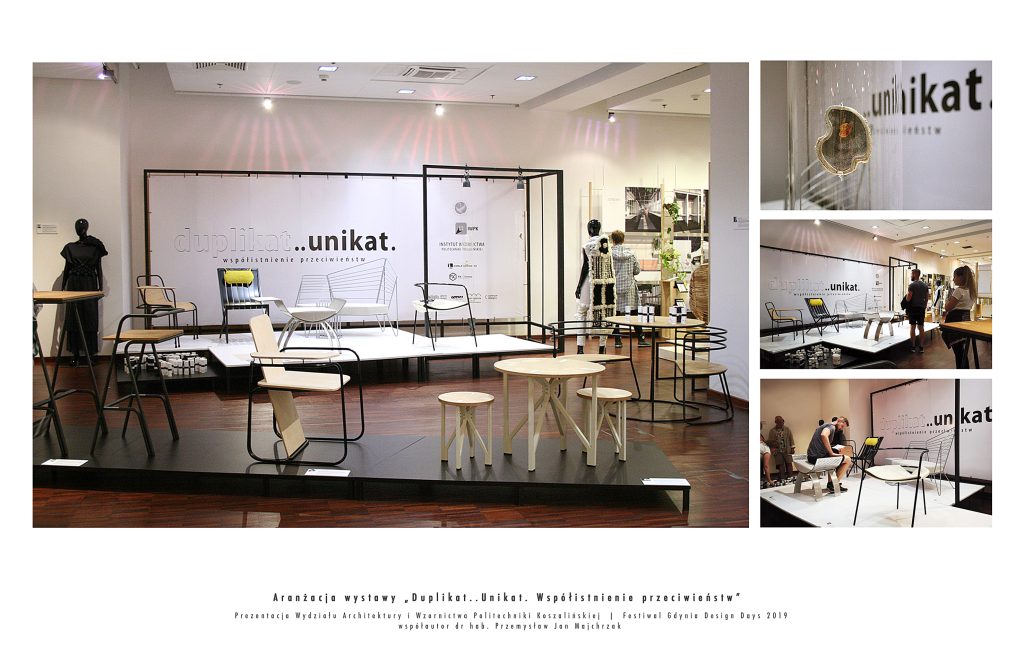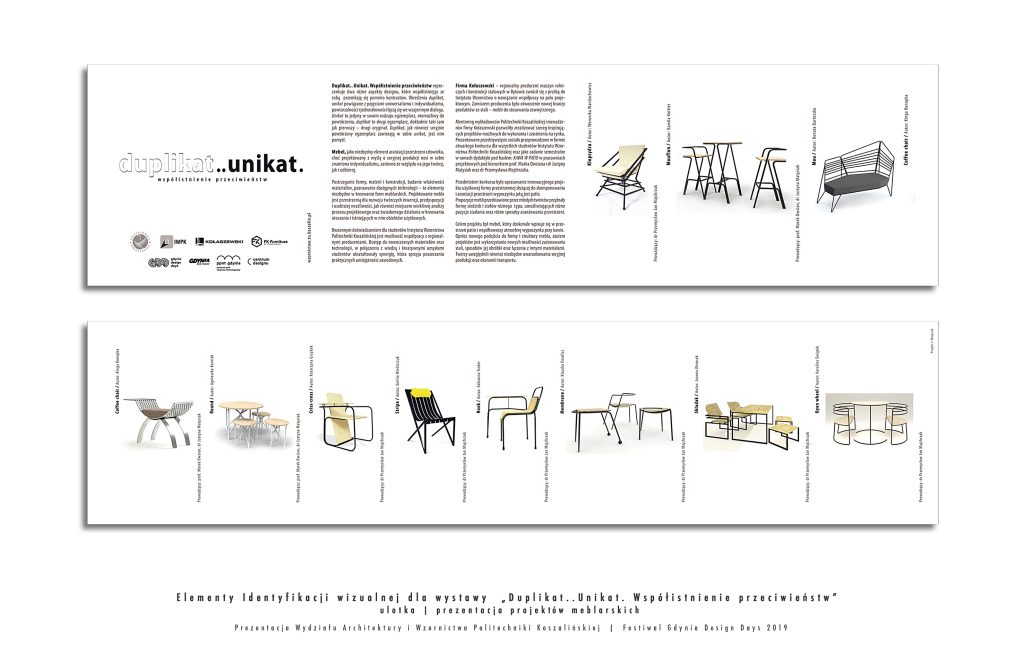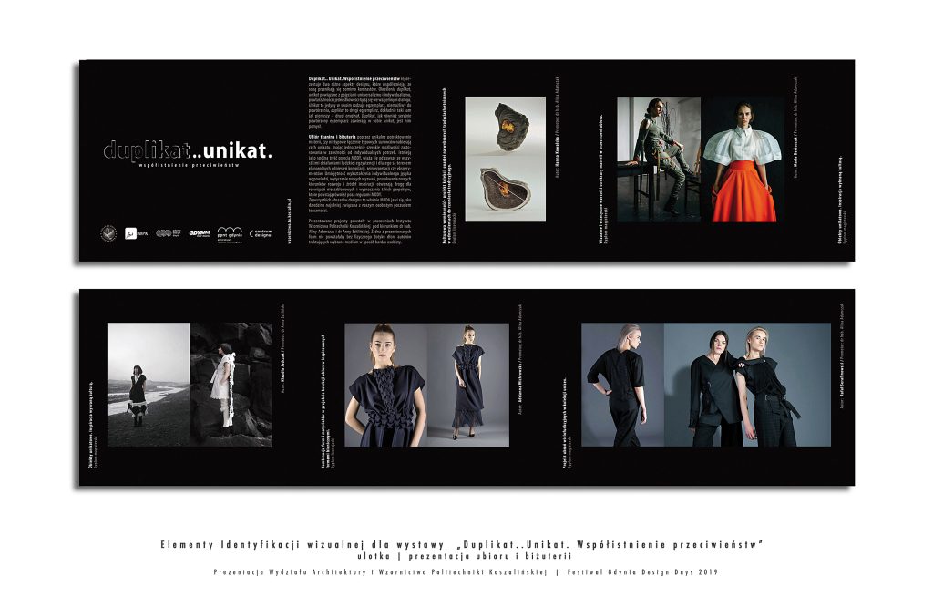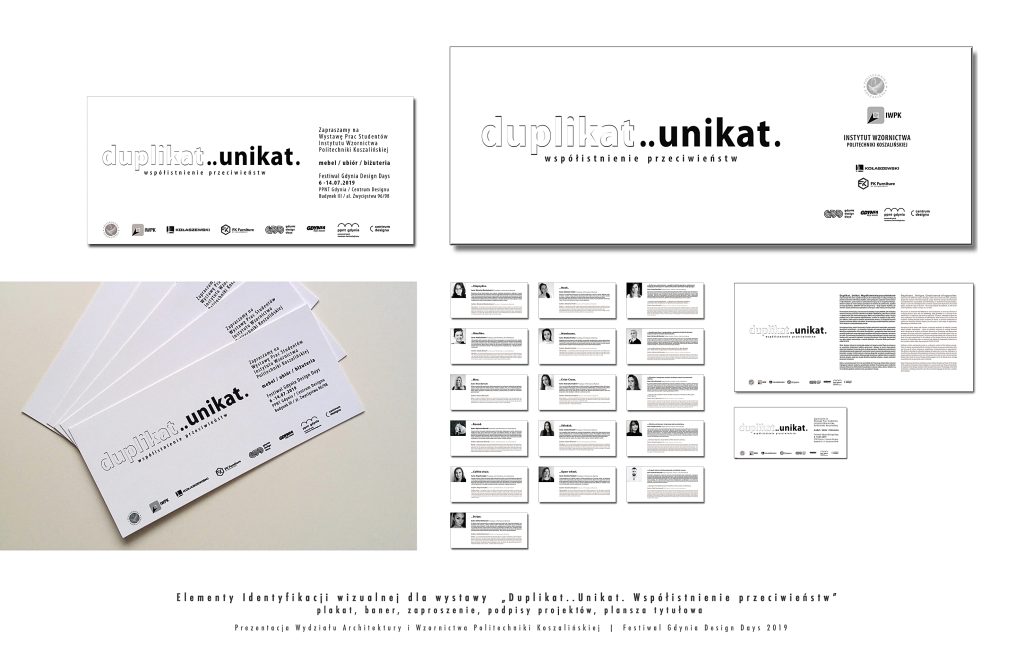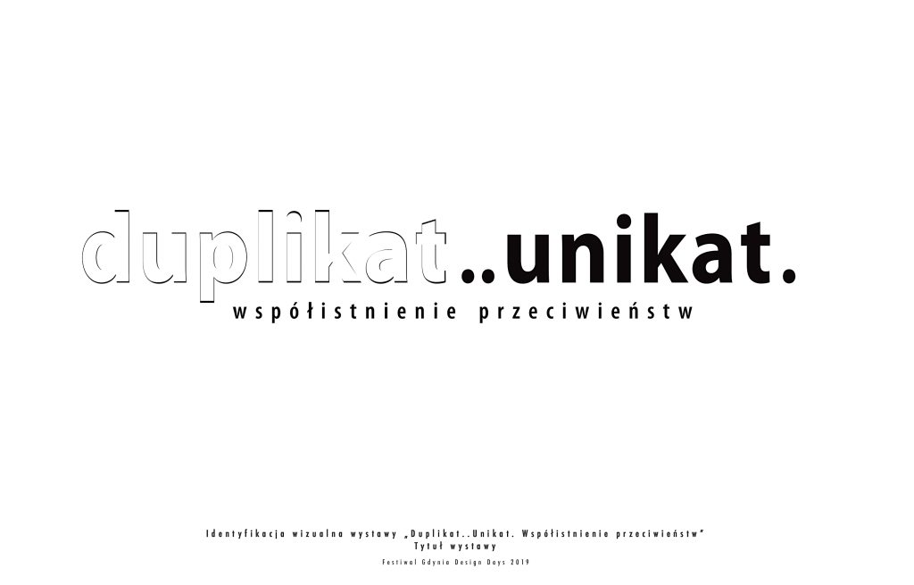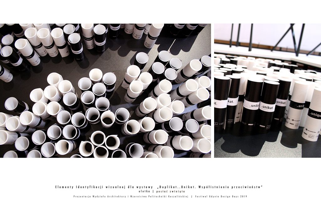 - Identyfikacja wizualna i aranżacja wystawy Duplikat..Unikat. Współistnienie przeciwieństw. Prezentacja dorobku Wydziału Architektury i Wzornictwa Politechniki Koszalińskiej w ramach festiwalu Gdynia Design Days / Polaryzacja; 2019