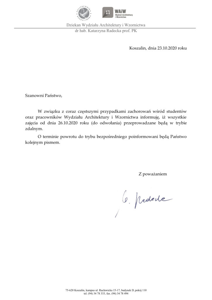 W związku z coraz częstszymi przypadkami zachorowań wśród studentów oraz pracowników Wydziału Architektury i Wzornictwa informuję, iż wszystkie zajęcia od dnia 26.10.2020 roku (do odwołania) przeprowadzane będą w trybie zdalnym.