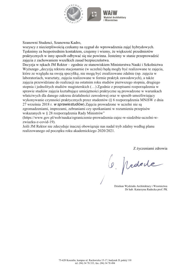 Szanowni studenci Wydziału Architektury i Wzornictwa